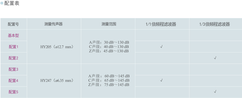 配用HY247 :A聲級(jí) 60 dB~145 dB、C聲級(jí) 65 dB~145 dB、Z聲級(jí) 75 dB~145 dB